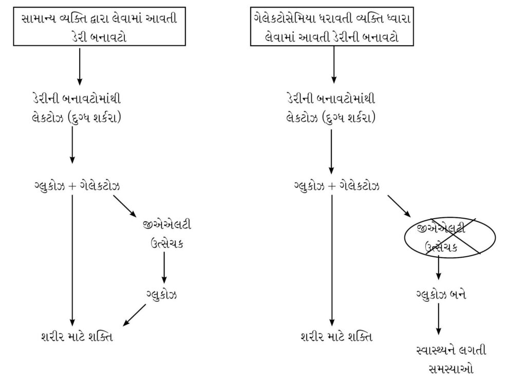આકૃતિ-૧ : સામાન્ય વ્યક્તિ અને ગેલેકટોસેમિયા ધરાવતી વ્યક્તિ દ્વારા ડેરીની બનાવટોનો ઉપયોગ