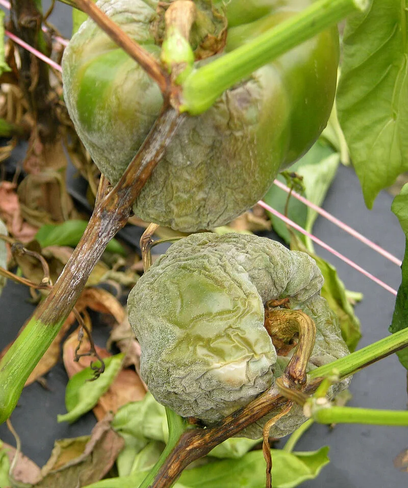 ફાયટોપ્થોરા ફુગથી થતો આ રોગ ફૂલો અને ફળો બેસવાના તબક્કે થાય છે જેમાં પાન ઉપર પાણી પોચા ભૂરાં ટપકાં પડે છે. જે પાન ઉપર ફેલાતાં પાન કાળું પડી જાય છે છેવટે છોડ નબળો પડી 2 થી 3 દિવસમાં મરી જાય છે. ભારે અને સતત વરસાદ સાથે ઊંચો ભેજ હોય ત્યારે આ રોગ વ્યાપક પ્રમાણમાં ફેલાય છે. નેટહાઉસમાં જો આ ફુગનો ઉપદ્રવ થાય તો 40 થી 80 ટકા જેટલું પાકને નુક્સાન થાય છે.