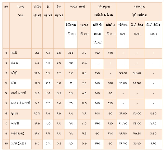 વિવિધ ધાન્યોમાં રહેલ પોષકતત્વો(૧૦૦ ગ્રામમાં)