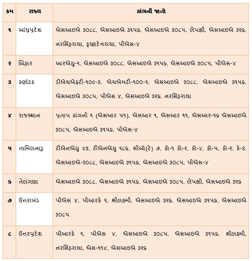 કાંગની જાતો : ભારતના વિવિધ રાજ્યોમાં વાવેતર કરવામાં આવતી કાંગની જાતો કોઠામાં દર્શાવેલ છે.