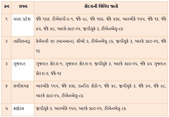 ભારતના વિવિધ રાજ્યોમાં વાવેતર કરવામાં આવતી કોદરાની જાતો કોઠામાં દર્શાવેલ છે.