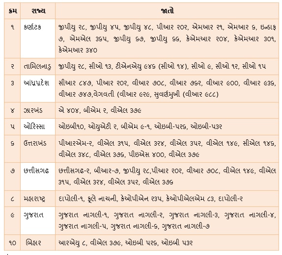 વિવિધ રાજ્યોમાં વાવેતર કરવામાં આવતી નાગલીની જાતો કોઠામાં દર્શાવેલ છે.