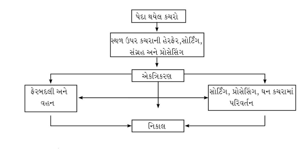 તેમાં ઘન કચરાને એકઠો કરવો, વહન કરી કેન્દ્રિય જગ્યાએ લઈ જવો અને વહન કરી નક્કી કરેલ સ્થળે નિકાલ કરવો વગેરેનો સમાવેશ થાય છે.  એકત્ર કરેલ કચરાને હાનિકારક અને બિન હાનિકારક એક બે ભાગમાં વહેંચવામાં આવે છે.