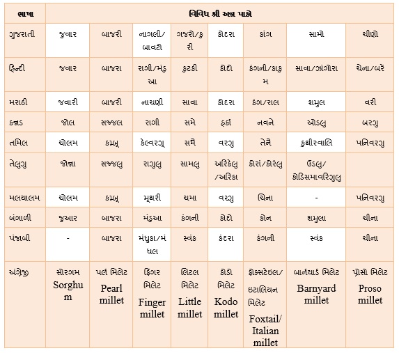 ભારતના શ્રી અન્નના મુખ્ય પાકોમાં જુવાર, બાજરી, રાગી, કુરી, કોદરા, સામો અને ચીણાનો સમાવેશ થાય છે. આફ્રિકાના કેટલાક દેશોમાં ફોનિયા અને ટેફ જેવા મોટા દાણાવાળા ધાન્ય ઉગાડાય છે. ભારતમાં હિમાલયના વિસ્તારો અને ઉત્તર ભારત થી માંડી દક્ષિણ ભારતના રાજ્યોમાં વિવિધ પ્રકારના શ્રી અન્ન ઉગાડવામાં આવે છે. ભારતની વિવિધ ભાષાઓમાં શ્રી અન્નના વિવિધ પાકોના નામોની વિગત કોઠામાં દર્શાવેલ છે.
